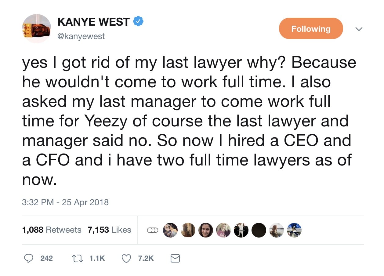 Today, West said he wanted his manager and lawyer to work full time for him but they said no, so he hired a new team instead.
