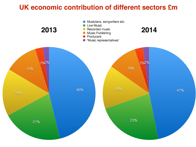 Interesting to note in the year-on-year comparison below that the revenues from ‘musicians, composers…’ and live music sectors both grew year-on-year, but money generated by music publishing and record labels shrunk.
