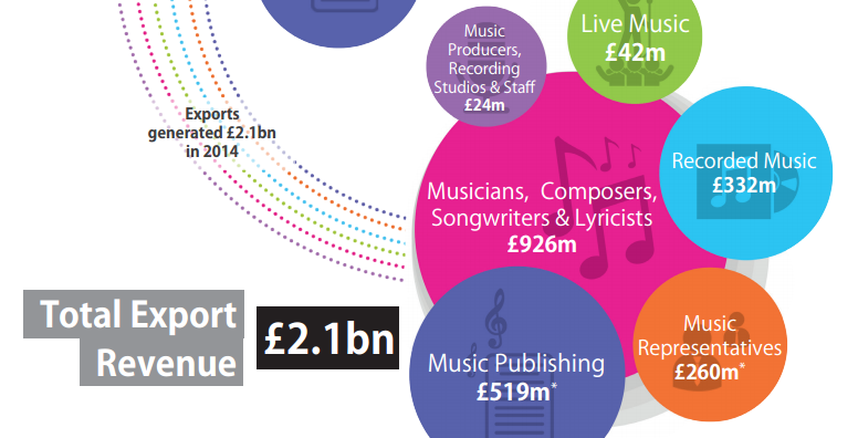 Music publishing exports (£519m) actually beat record label exports (£332m).