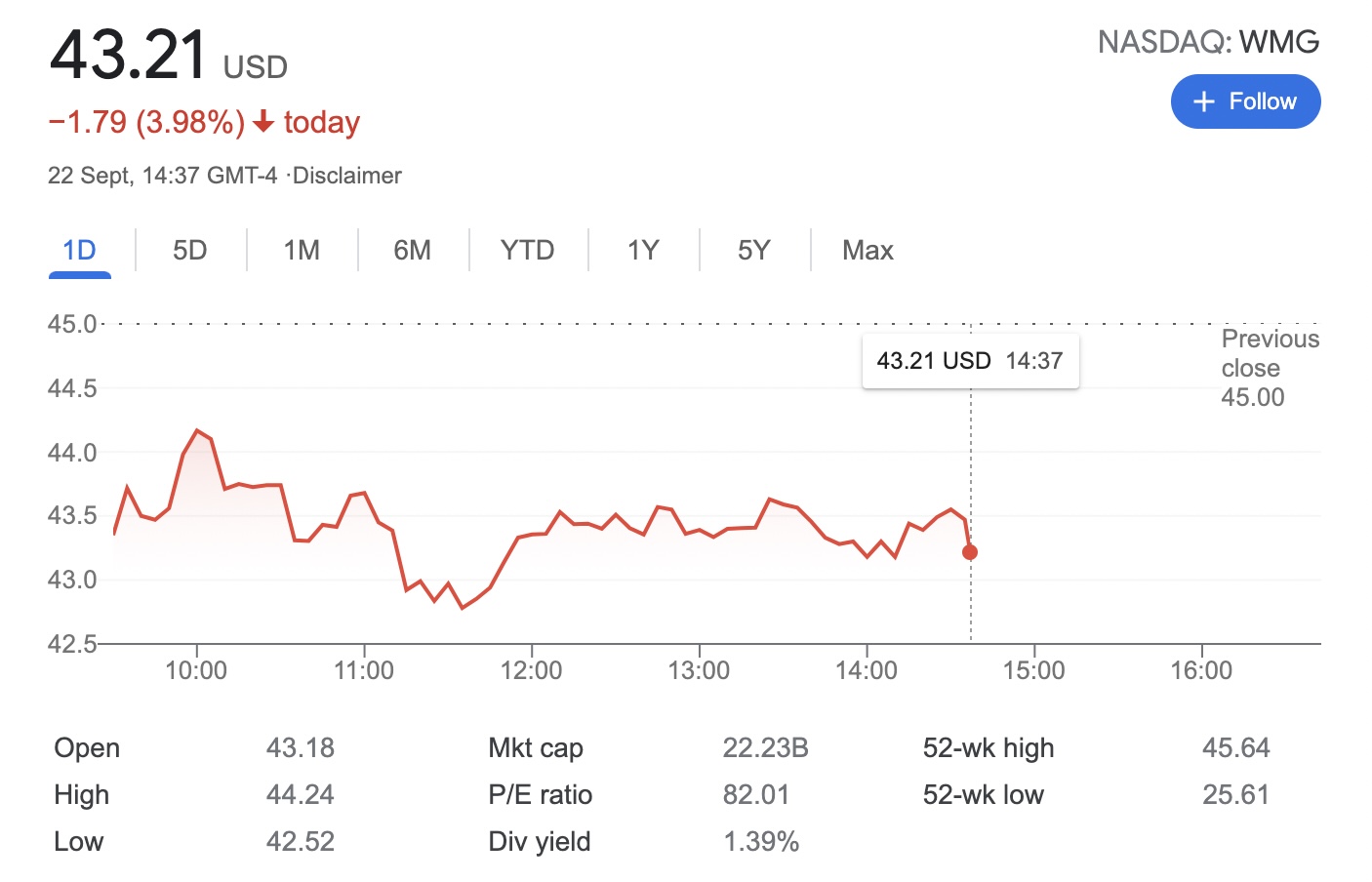 At the time of publishing on Wednesday (September 22), WMG’s share price is $43.21, which translates to a market cap value of $22.23 billion.