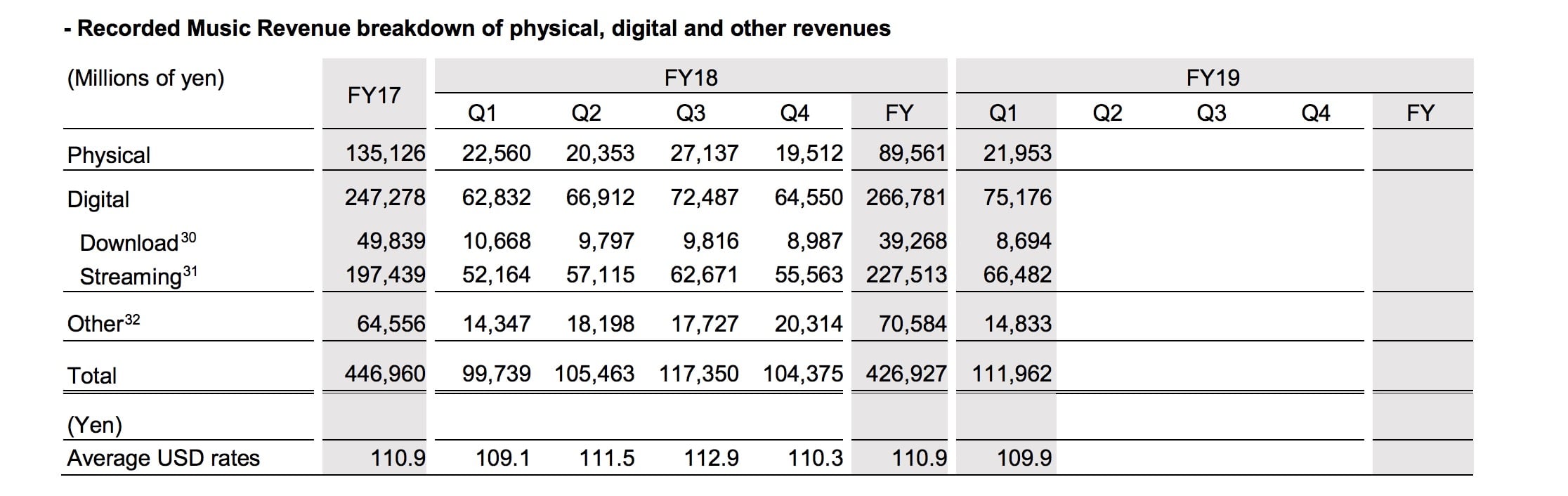 You can see the Yen-level stats from Sony’s quarterly and annual recorded music results below: