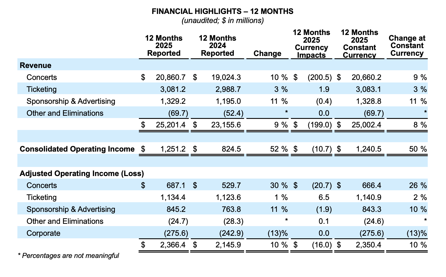 Live Nation reported operating income of $1.25 billion for the 12-month period ending December 31, 2025. That was up 52% YoY, though a $454.9 million charge weighed on 2024’s results, relating to the cost of settling claims from the 2021 Astroworld tragedy.