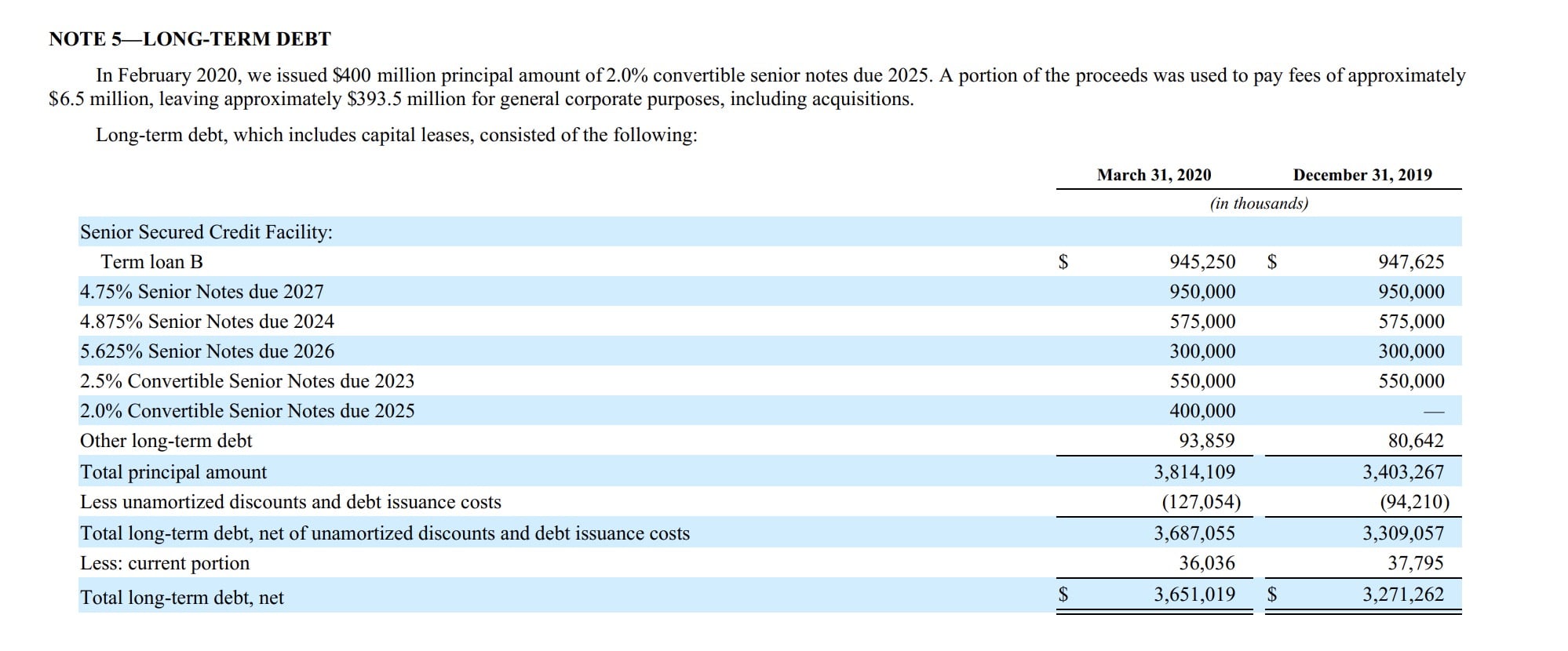 As reported last week, the $1.2bn secured note sale will take Live Nation’s long-term debt up to approximately $4.85bn (see below for LN’s published debt list as of the end of Q1 2020).