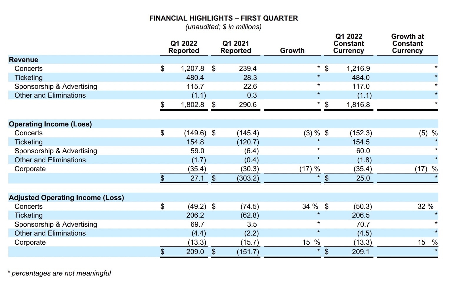 Across concerts, ticketing and advertising & sponsorship, Live Nation’s operating income was $27 Million and Adjusted Operating income was $209 Million.