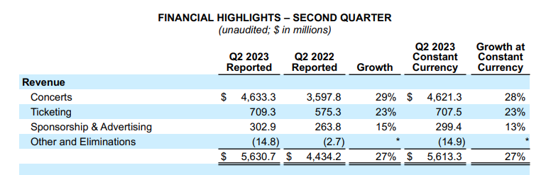 Revenues from its concerts division came in at $4.63 billion, up up 28% YoY on a constant currency basis. Ticketing (i.e. Ticketmaster) brought in $709.3 million, up 23% YoY, while sponsorships and advertising brought in $302.9 million, up 13% YoY.