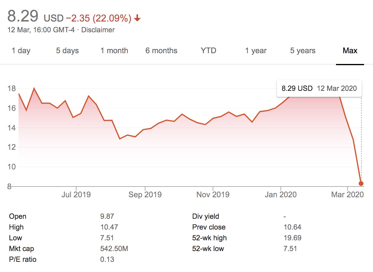 The company’s volatile stock was worth more than double its current price as recently as 16 days ago, at the close of Tuesday, February 25 ($16.80).