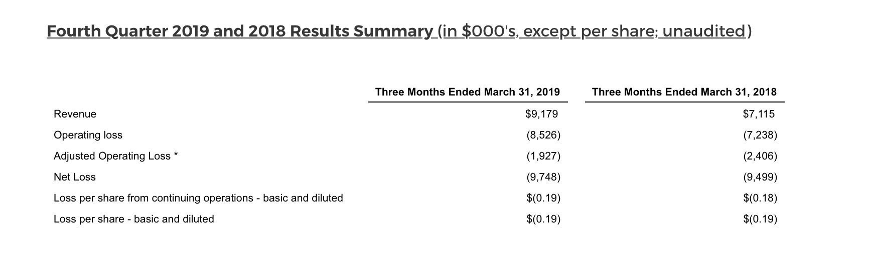 Excluding non-cash and non-recurring expenses of $6.6m, the company’s Adjusted Operating Loss (“AOL”) for the quarter was $1.9, an improvement from AOL of $2.4m in the same quarter last year.