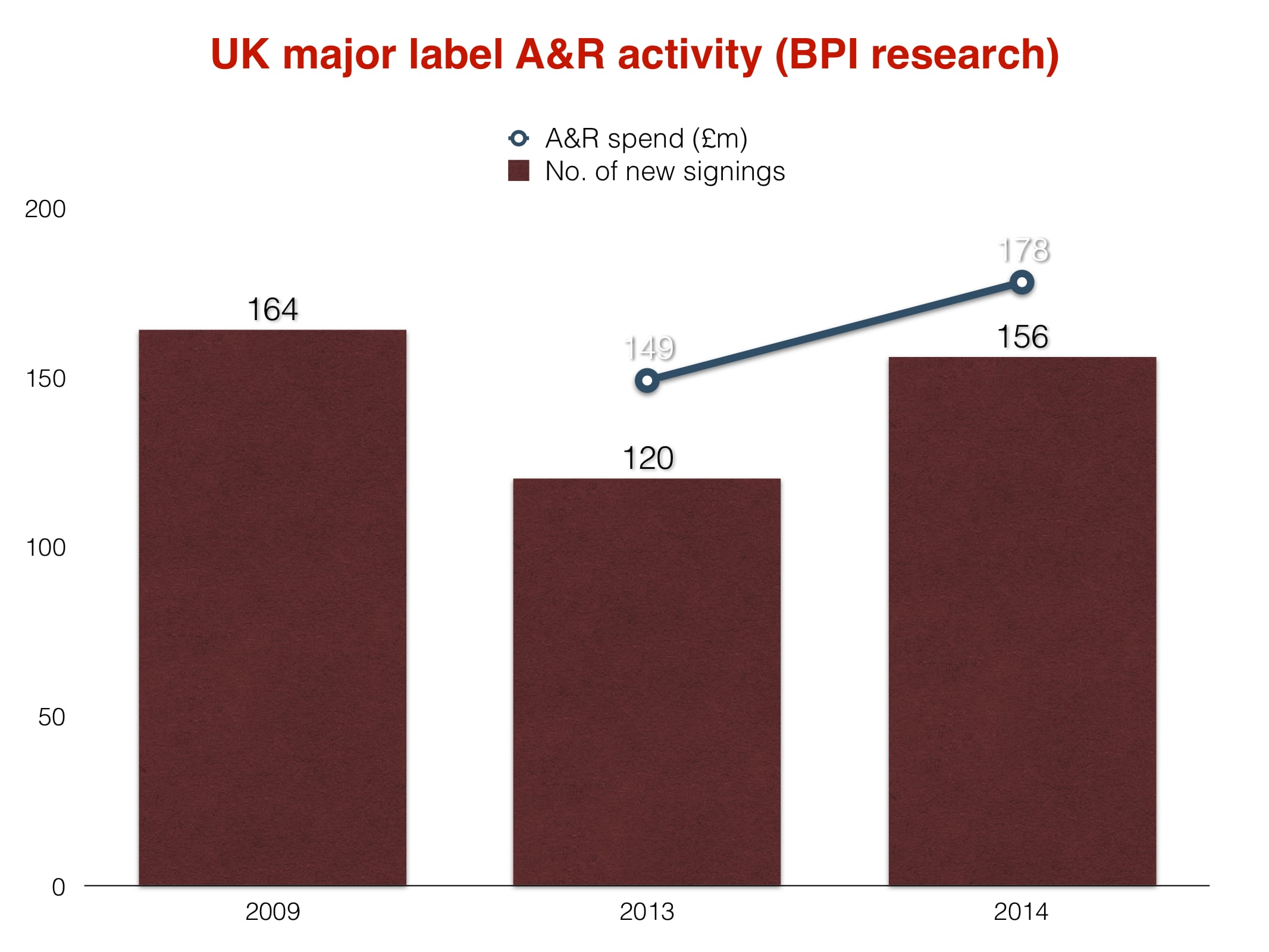 The BPI says that the £178 million A&R figure spent by UK record labels in 2014 represented a 19% increase on the £149 million outlay in 2013 and was equivalent to a quarter (25.4%) of the labels’ annual revenues.
