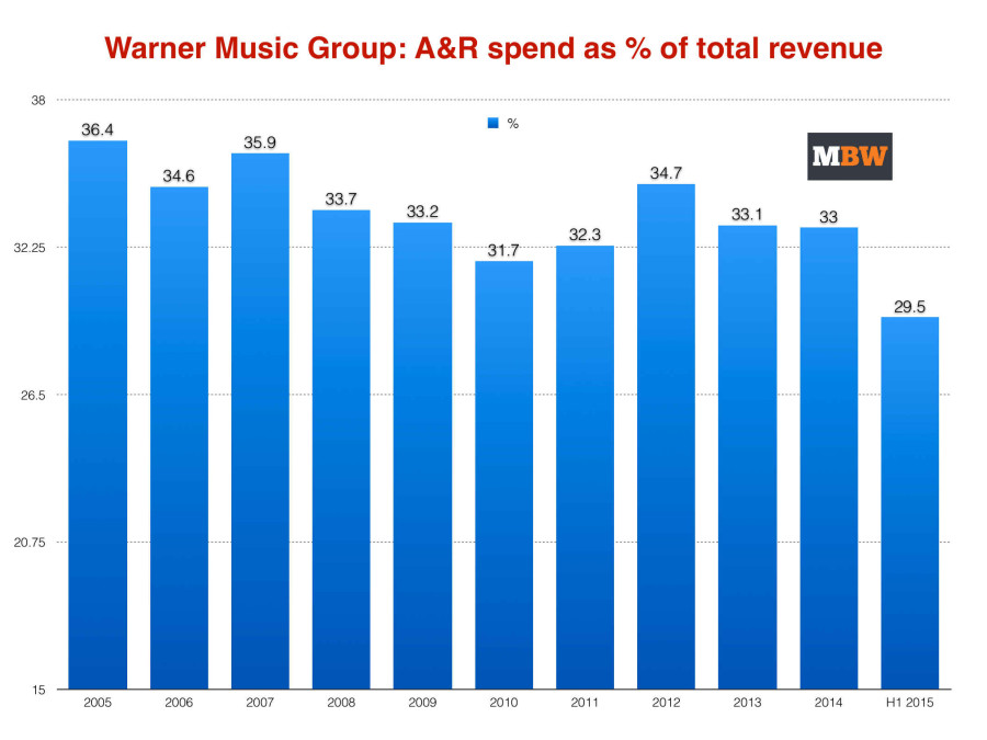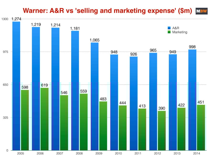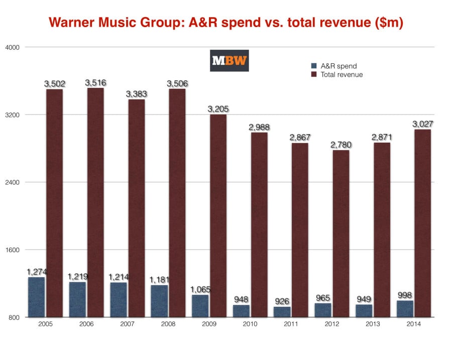 In 2014 Warner’s A&R investment was at its highest for five years – 7.7% higher than the rock bottom of FY2011, when it spent $926m on artists.