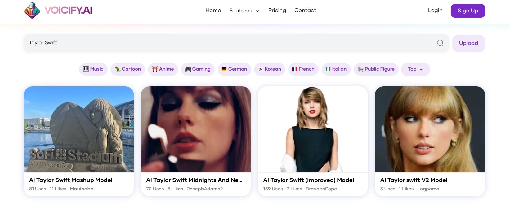 Searching for a Taylor Swift voice clone on Voicify.ai