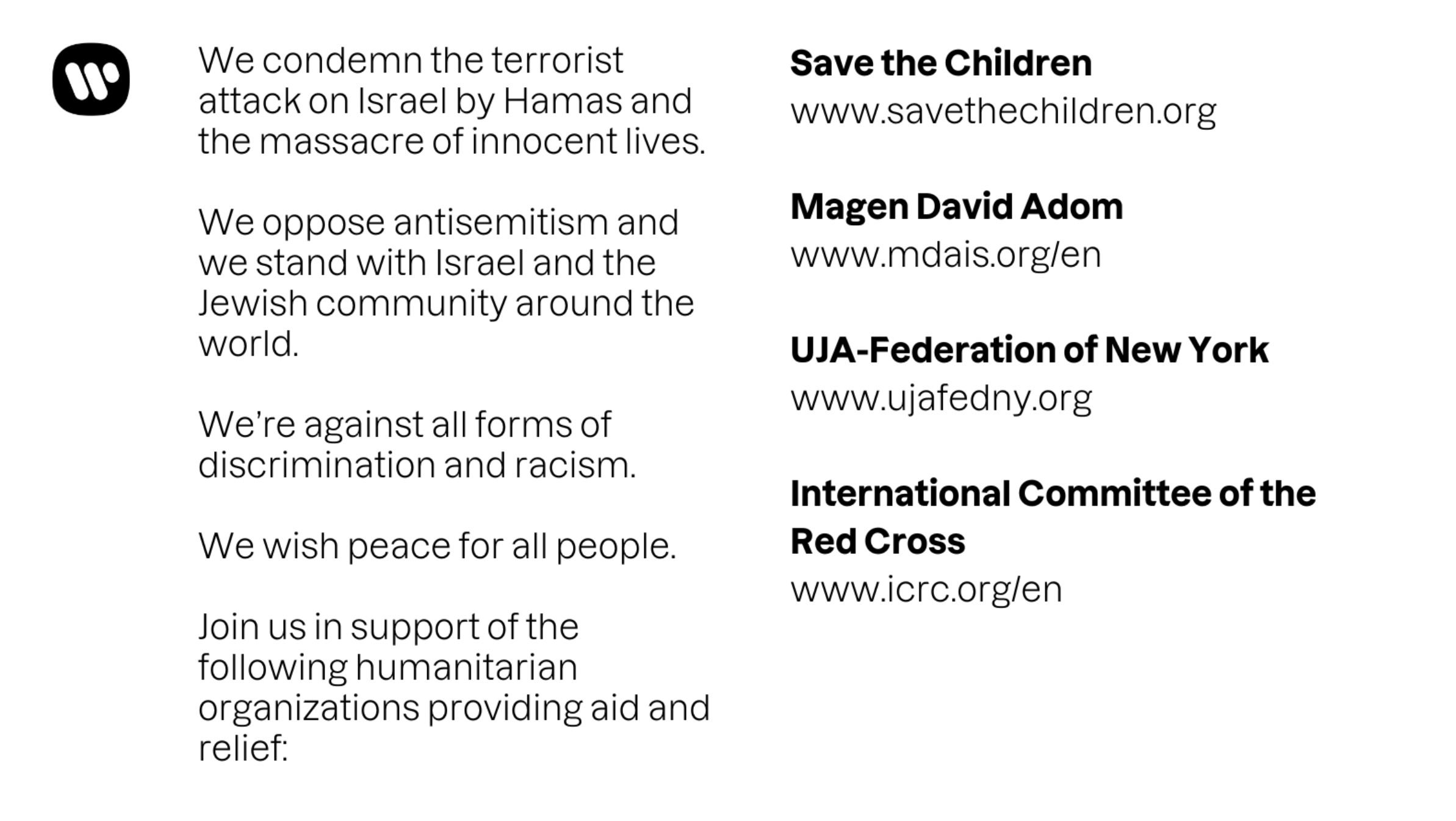 In its own statement, posted on X (formerly Twitter) Warner Music Group wrote : “We condemn the terrorist attack on Israel by Hamas and the massacre of innocent lives we oppose antisemitism and we stand with Israel and the Jewish community around the world.”