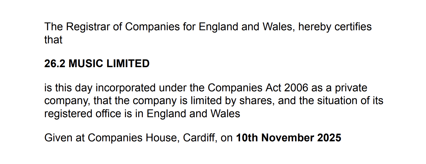 The two entities – 26.2 Music Ltd and 26.2 Services Ltd – were established in November, according to UK Companies House.