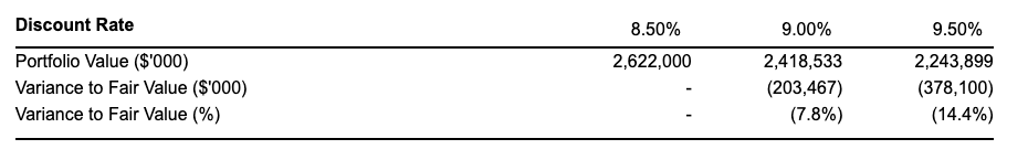 A segment of HSF’s latest financial report, mapping out the effect on the company’s ‘fair value’ by any prospective change in the valuer’s discount rate