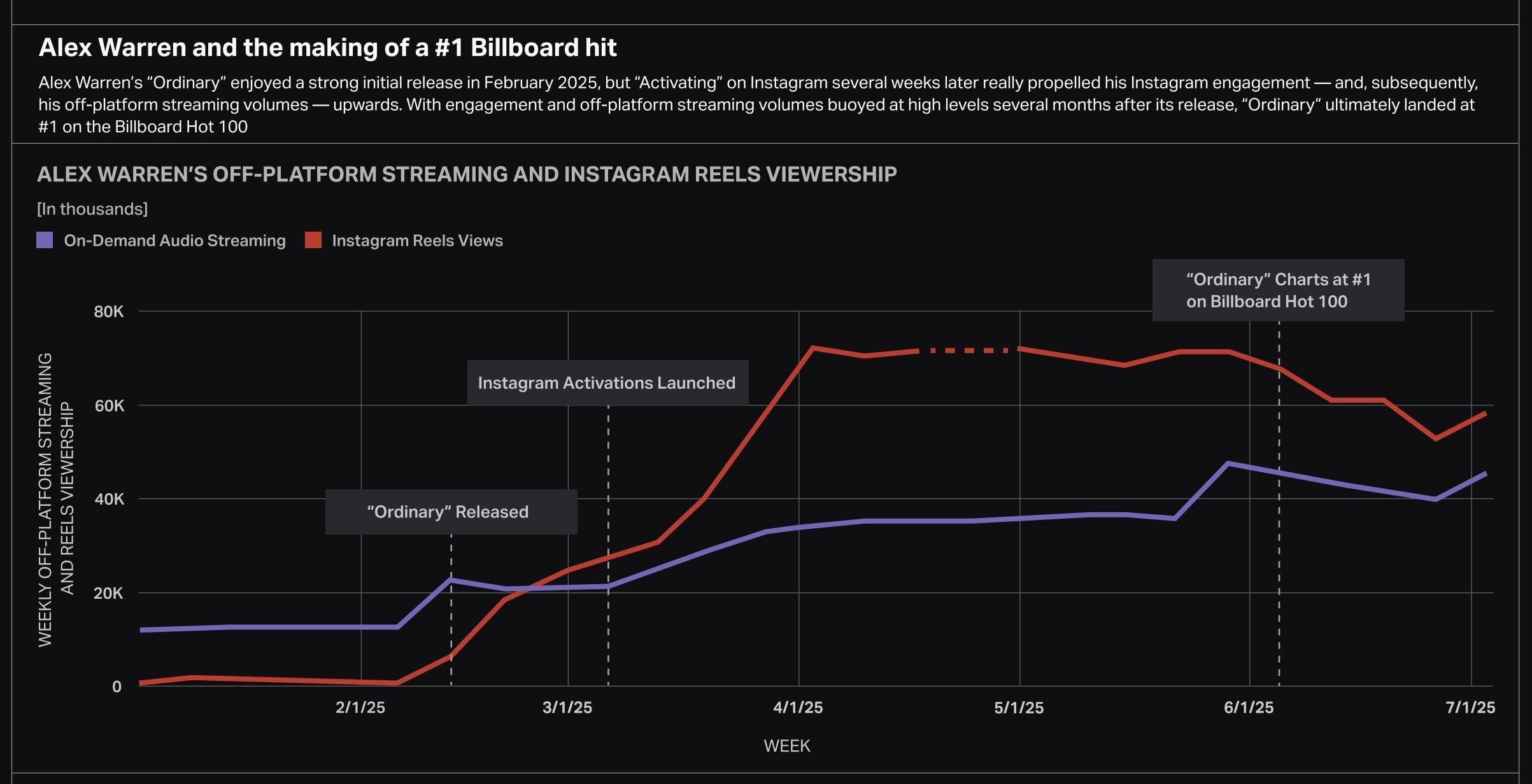 The report cited Alex Warren‘s song Ordinary as a case study. The song, released in February 2025, gained additional momentum after Instagram Activations were launched several weeks later, according to the report. Reels viewership and streaming volumes both climbed before the song reached No. 1 on the Billboard Hot 100.