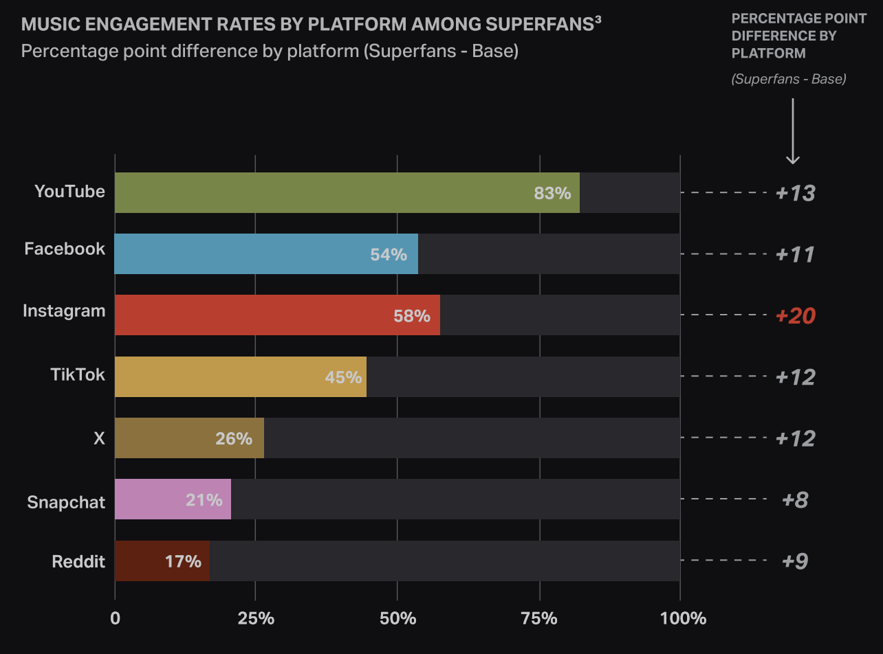 Digging further into that 58% superfan figure, Luminate found that Instagram ranks second only to YouTube (83%) among social platforms for superfan music engagement.