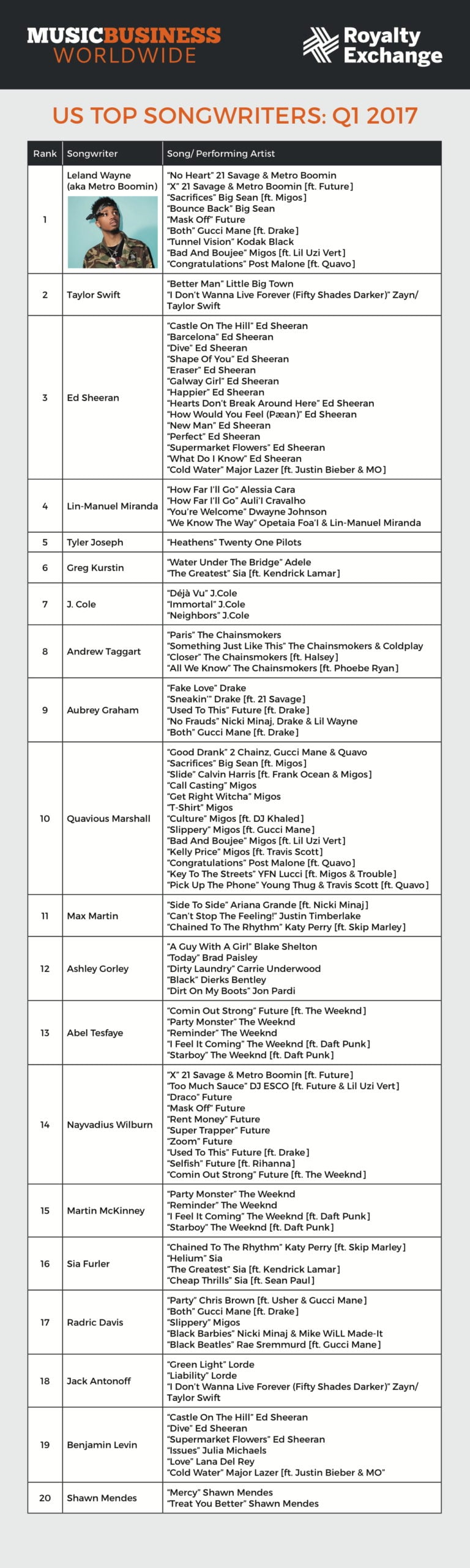 The data shows that Taylor Swift was the market’s second-biggest songwriter in the period, with Ed Sheeran in third place.