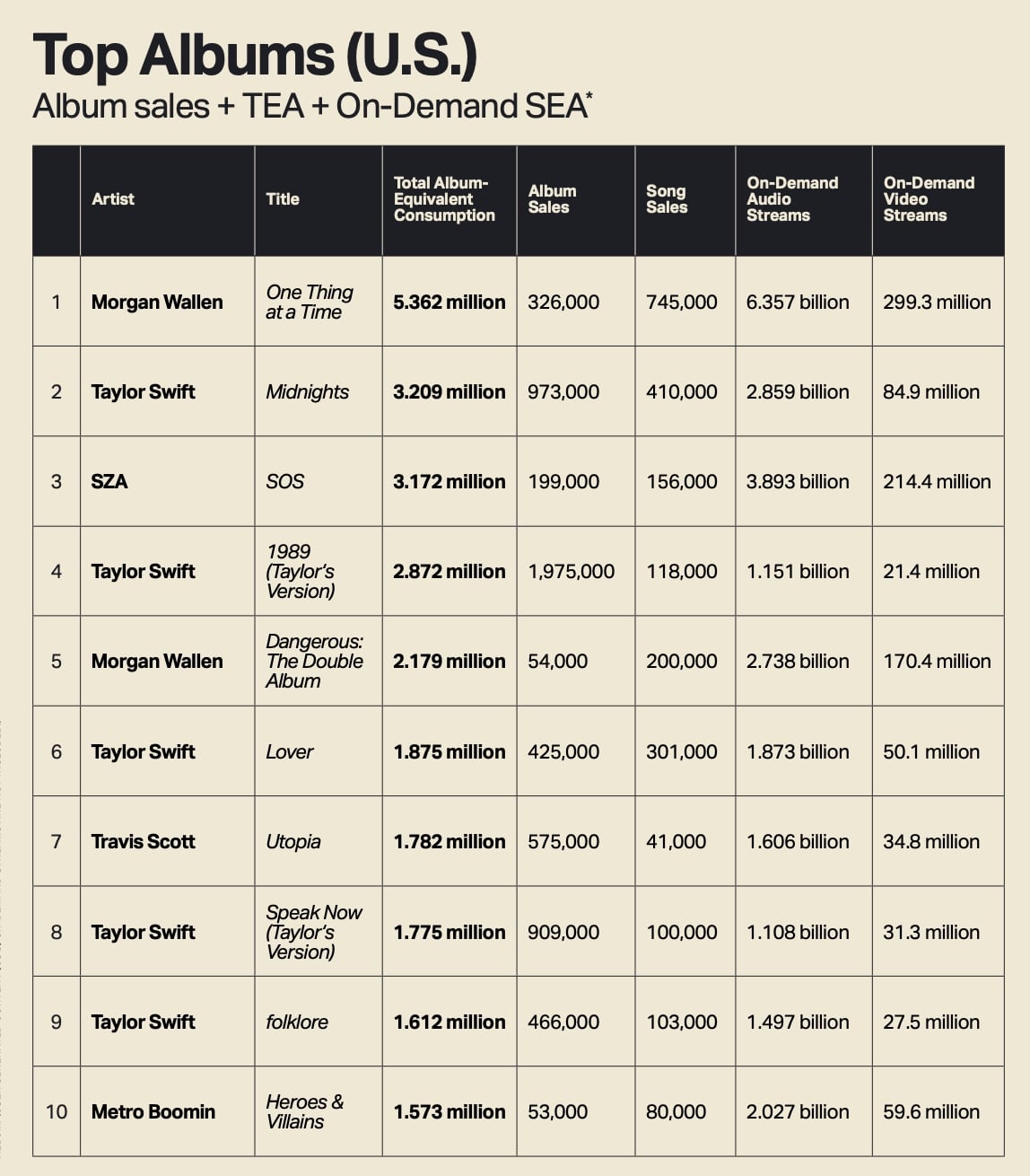 According to Luminate’s 2023 Year End Report, Wallen’s One Thing At a Time registered 5.362 million Total Album Equivalent Consumption (TAC) Units last year and 6.357 billion on-demand audio streams (see below).