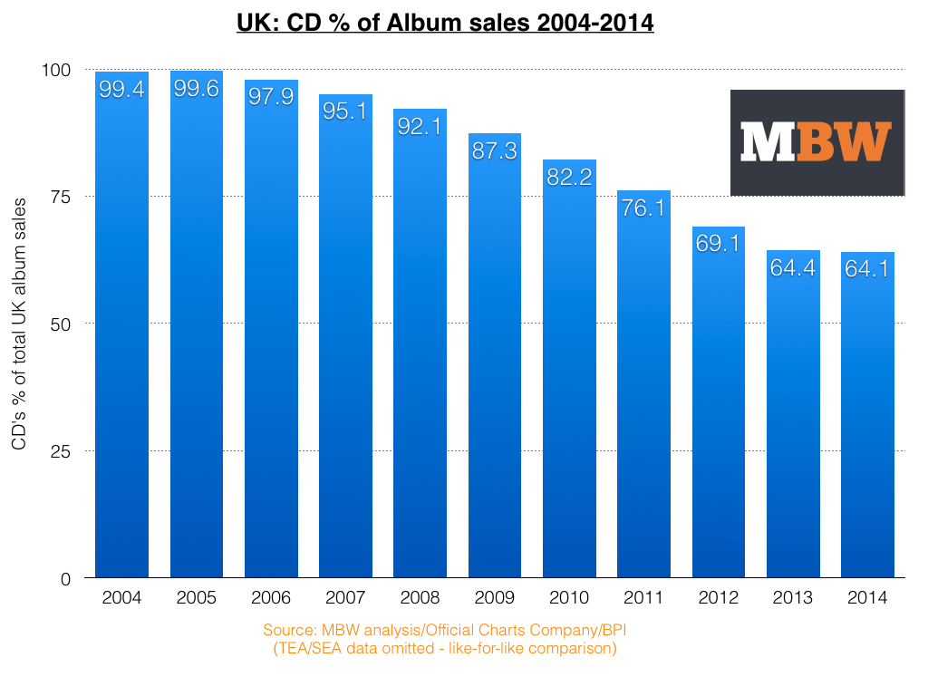 Indeed, in the UK (if you omit ‘Track Equivalent Albums’ and ‘Streaming Equivalent Albums’, which are essentially a way of smooshing together people’s individual track plays as ‘albums’) CD’s percentage of total album sales declined by just 0.46% in 2014, taking 64.1% of the total market.