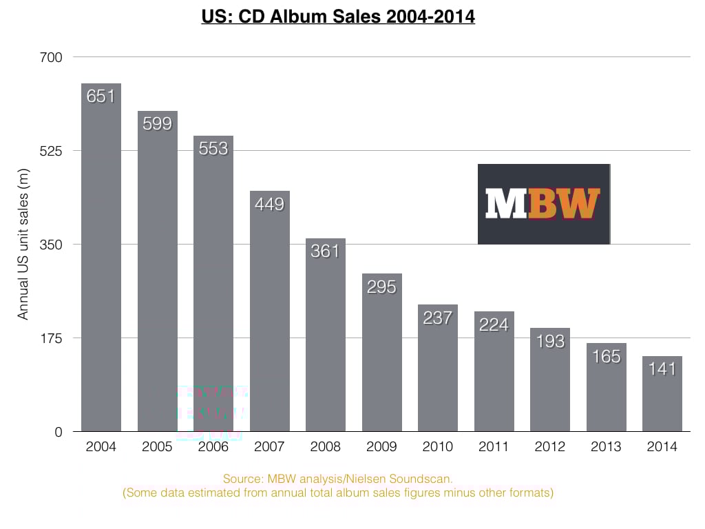 The UK has treated the CD slightly better, but it’s still taken a kicking: CD album sales dropped 66% between 2004 and 2014 – down from 162.4m to 55.7m.