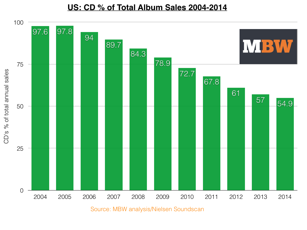 In 2014, the drop in CD’s US albums market share was just 3.7%, as it claimed 54.9% of total album sales.