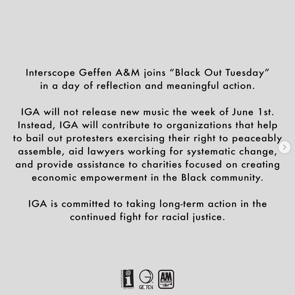 Posting this evening (May 31) on Instagram, Columbia Records said “Black Out Tuesday… is not a day off.