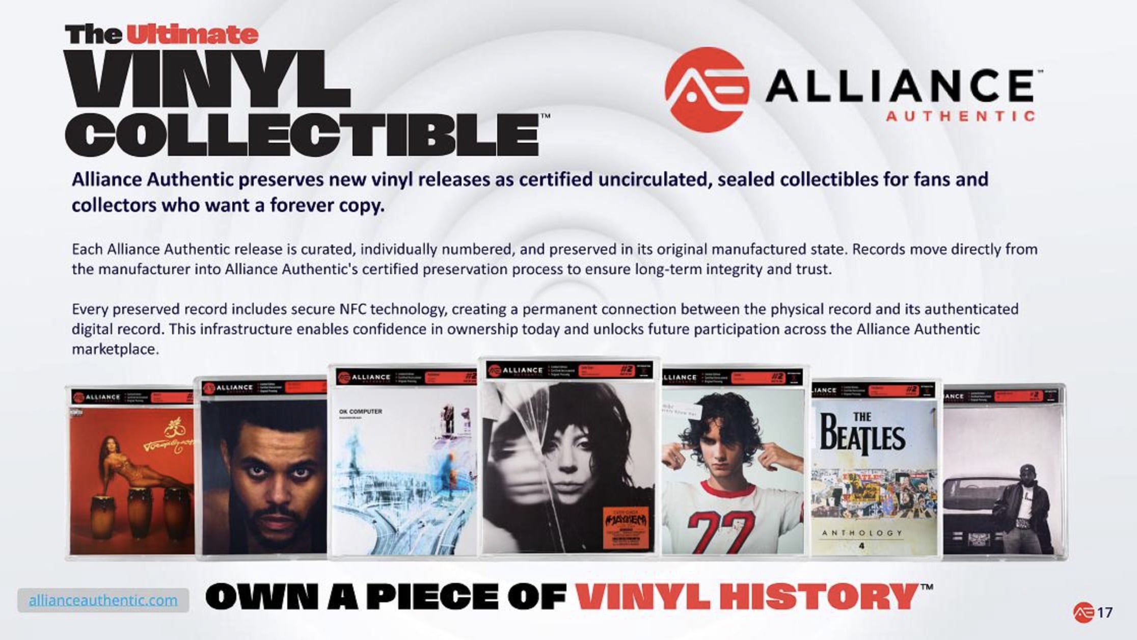 Alongside this, the company has launched a premium vinyl collectibles platform, Alliance Authentic, which aims to preserve new vinyl releases as certified, uncirculated collectibles – individually numbered and sealed in their original manufactured state, with NFC chips linking each physical record to an authenticated digital record.