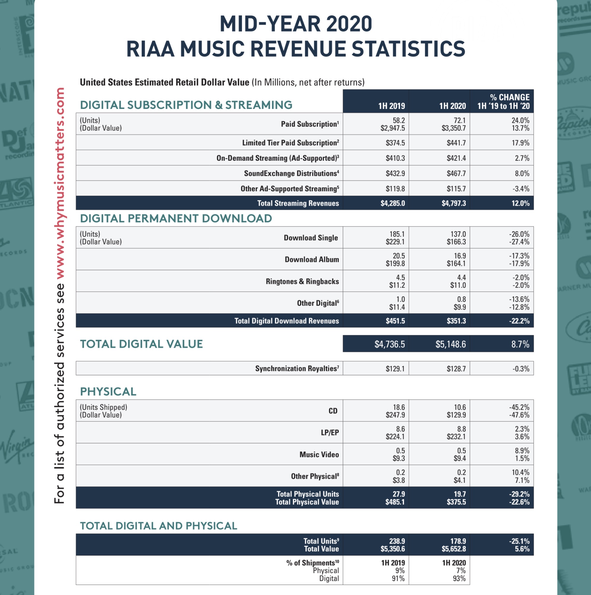 The RIAA said: “There was a significant impact from music retail and venue shutdown measures around Covid-19, as Q1 2020 declines were significantly less than Q2 compared with their respective periods the year prior.”