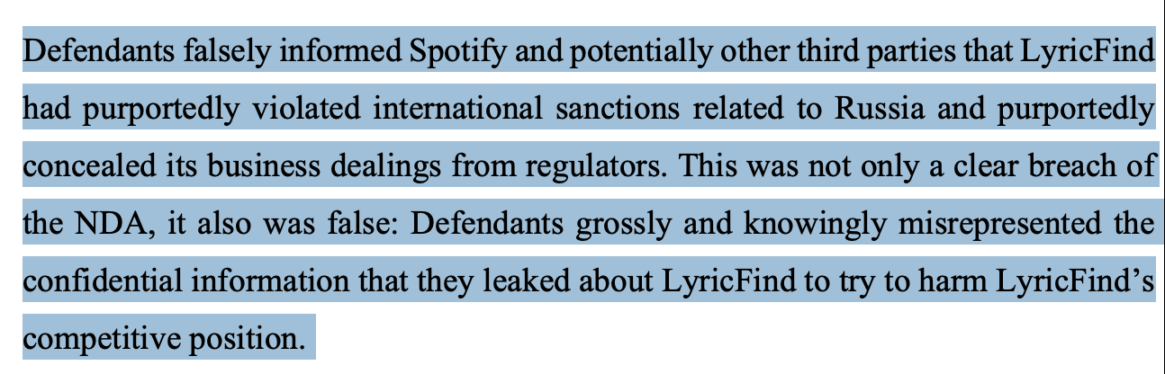 LyricFind states these allegations were “not only a clear breach of [a mutually signed] NDA” but also “grossly and knowingly misrepresent[ed]” information “to try to harm LyricFind’s competitive position”.
