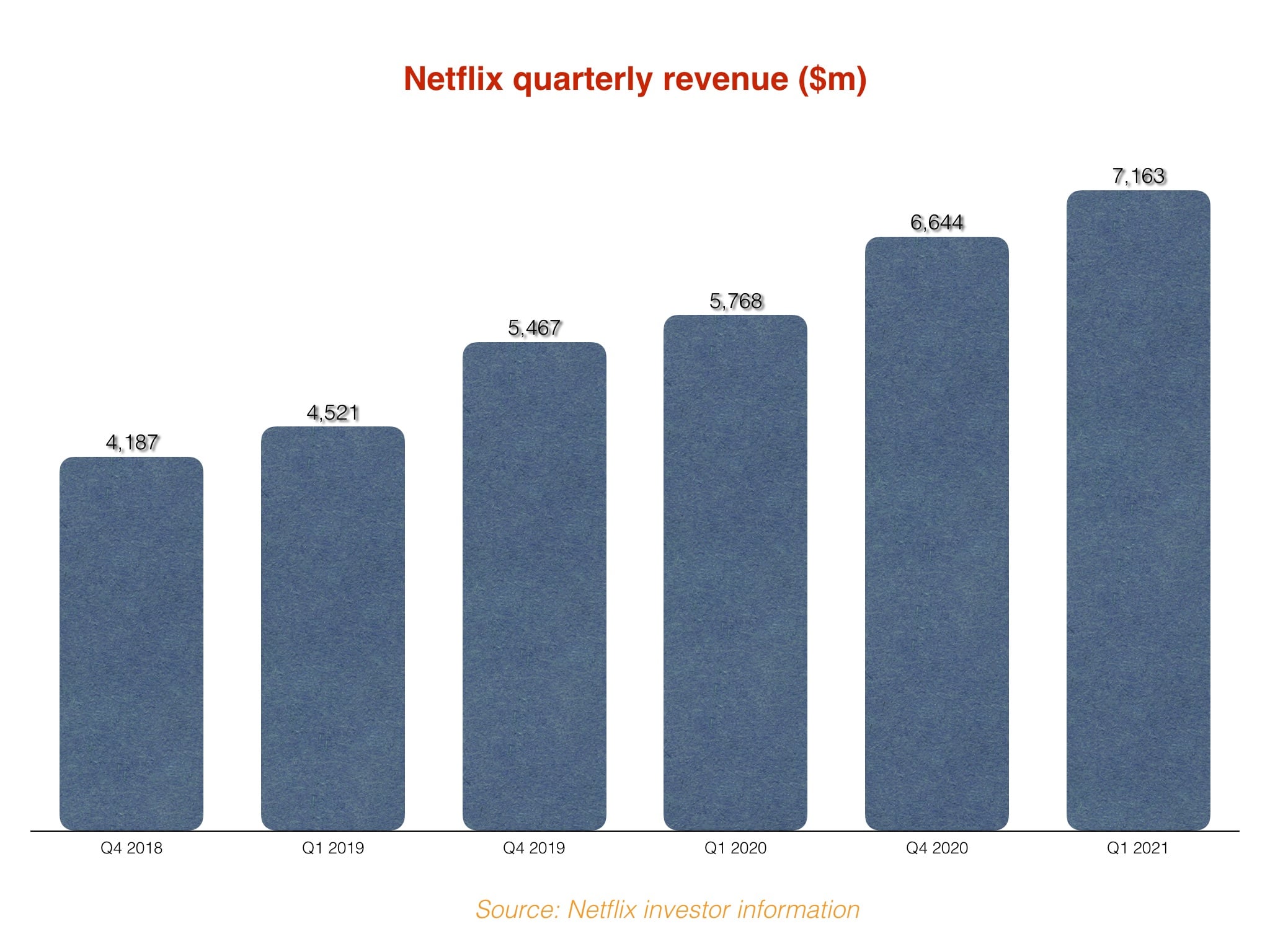 It was the same story quarter-on-quarter: in Q1 2021, Netflix’s quarterly revenues were up $519m on the prior quarter; in Q1 2020, the equivalent jump was smaller, at +$301m.