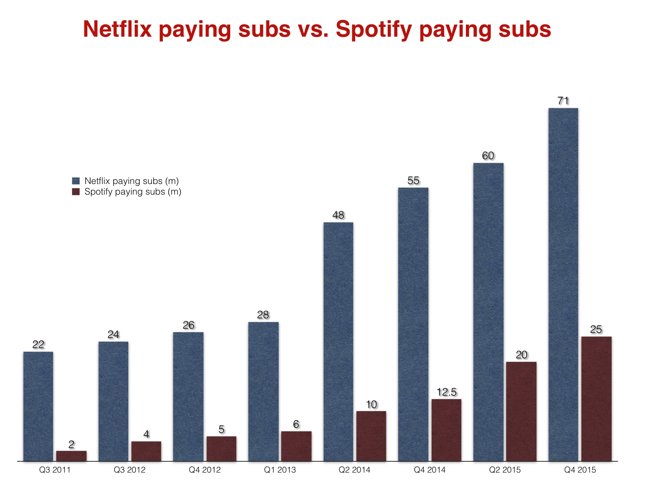 It’s also worth bearing in mind that Spotify now has around 100m total users. For Netflix in Q4 2015, that number stood at 77m (which means 6m people were enjoying their free trial).