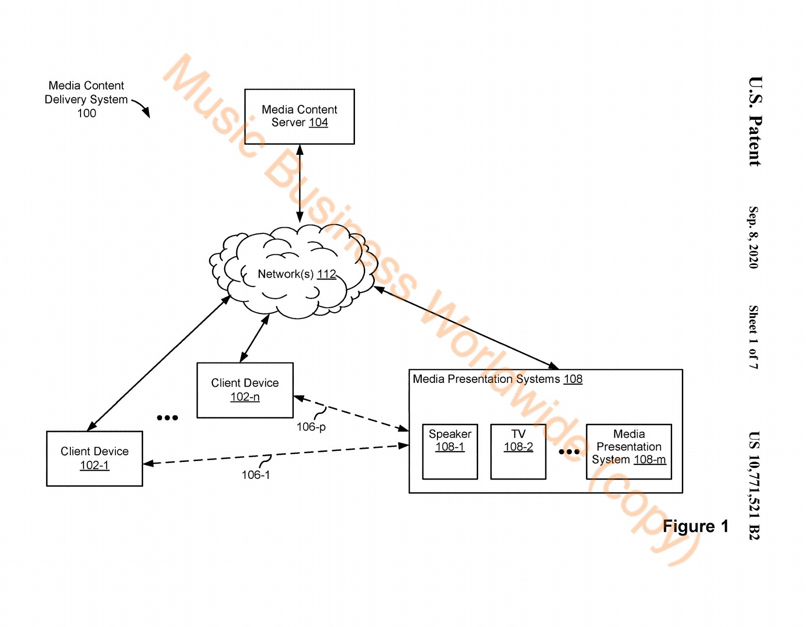 The client device in this instance is a mobile phone, while the media presentation system, according to the patent, could be a television or external speakers.