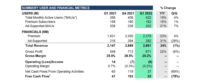 Premium Revenue grew 18% YoY (at constant currency) to €2.379 billion ($2.67bn), while ad-supported revenue grew by 22% YoY (at constant currency) to €282 million ($316m).