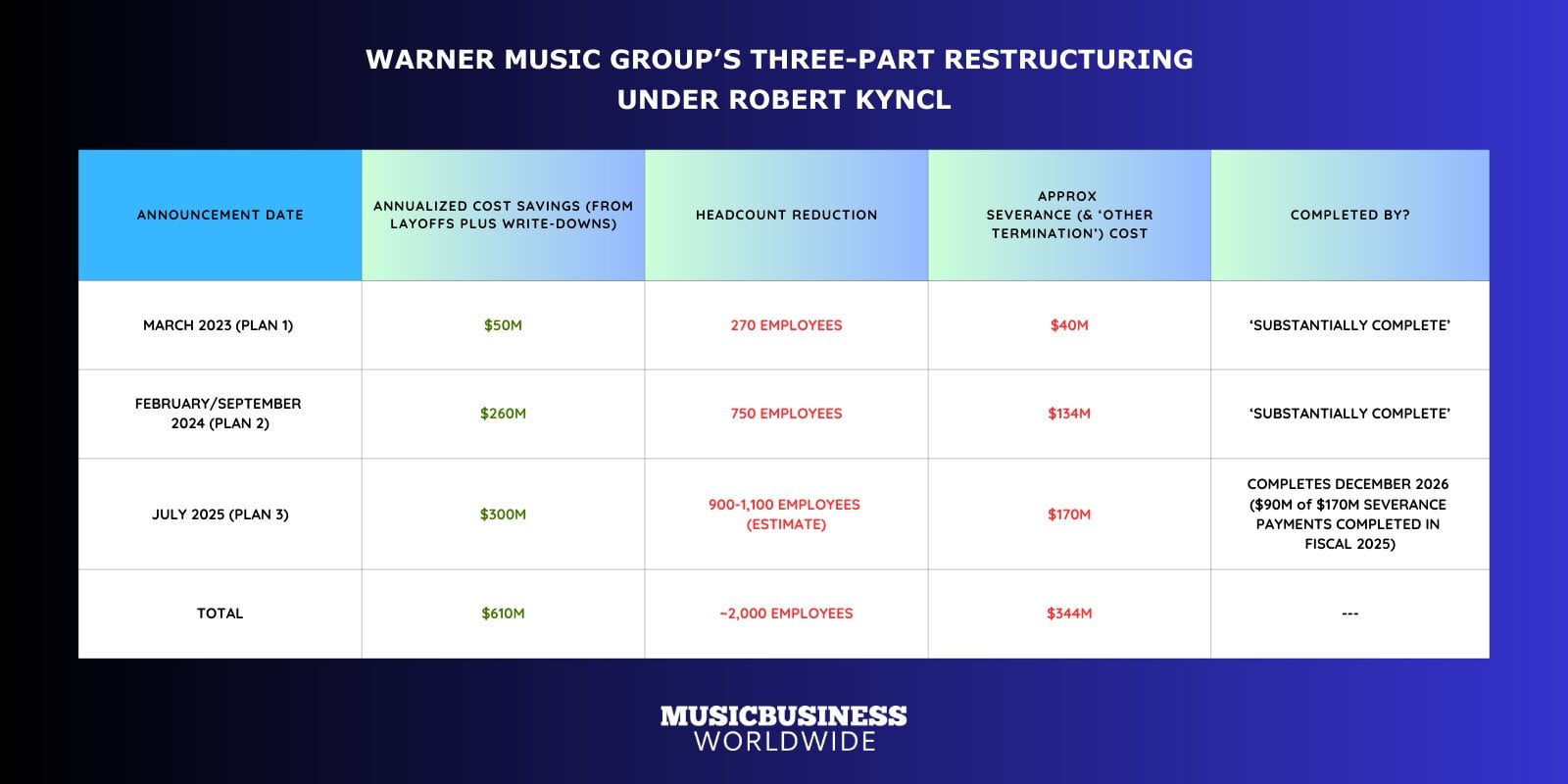 - And in July 2025, Kyncl announced a further $300M of annual cost-savings, of which $170M would be achieved via layoffs. (Coincidentally, $170M is also the amount WMG expects to pay out in severance as a result of these changes.)