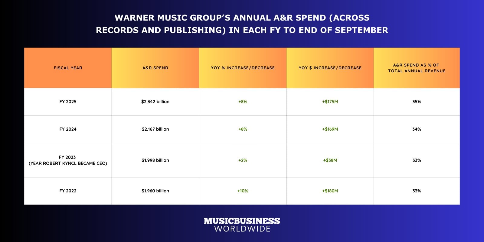In FY 2025, according to its SEC filings, Warner Music Group spent USD $2.34 billion on ‘A&R’ across records and publishing (this figure includes royalties and advances paid to talent, plus studio costs).