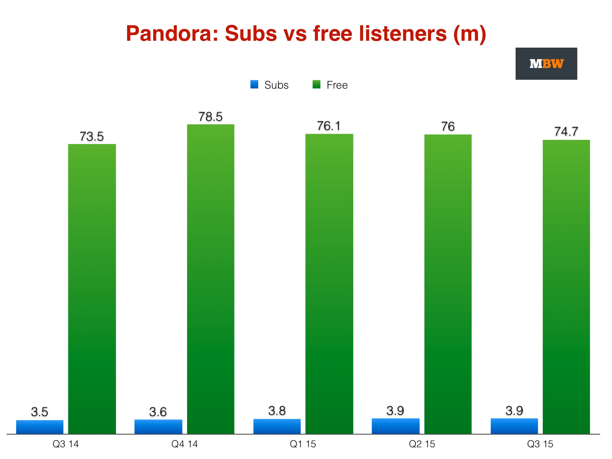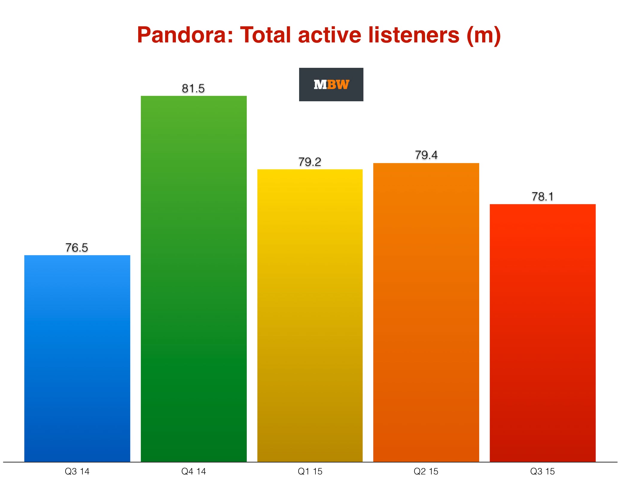 Pandora’s active listener numbers dropped quarter-on-quarter by 1.3m (1.6%) to 78.1m in the three months to end of September 2015 (Q3).
