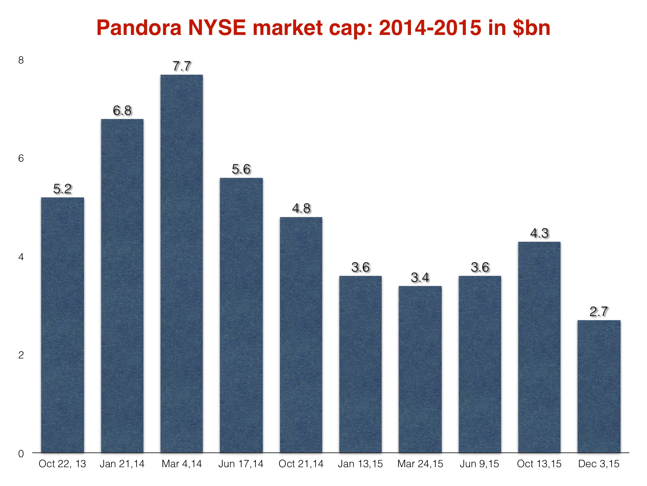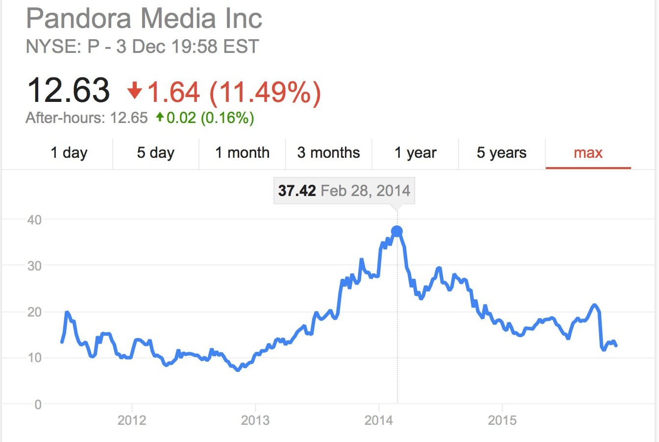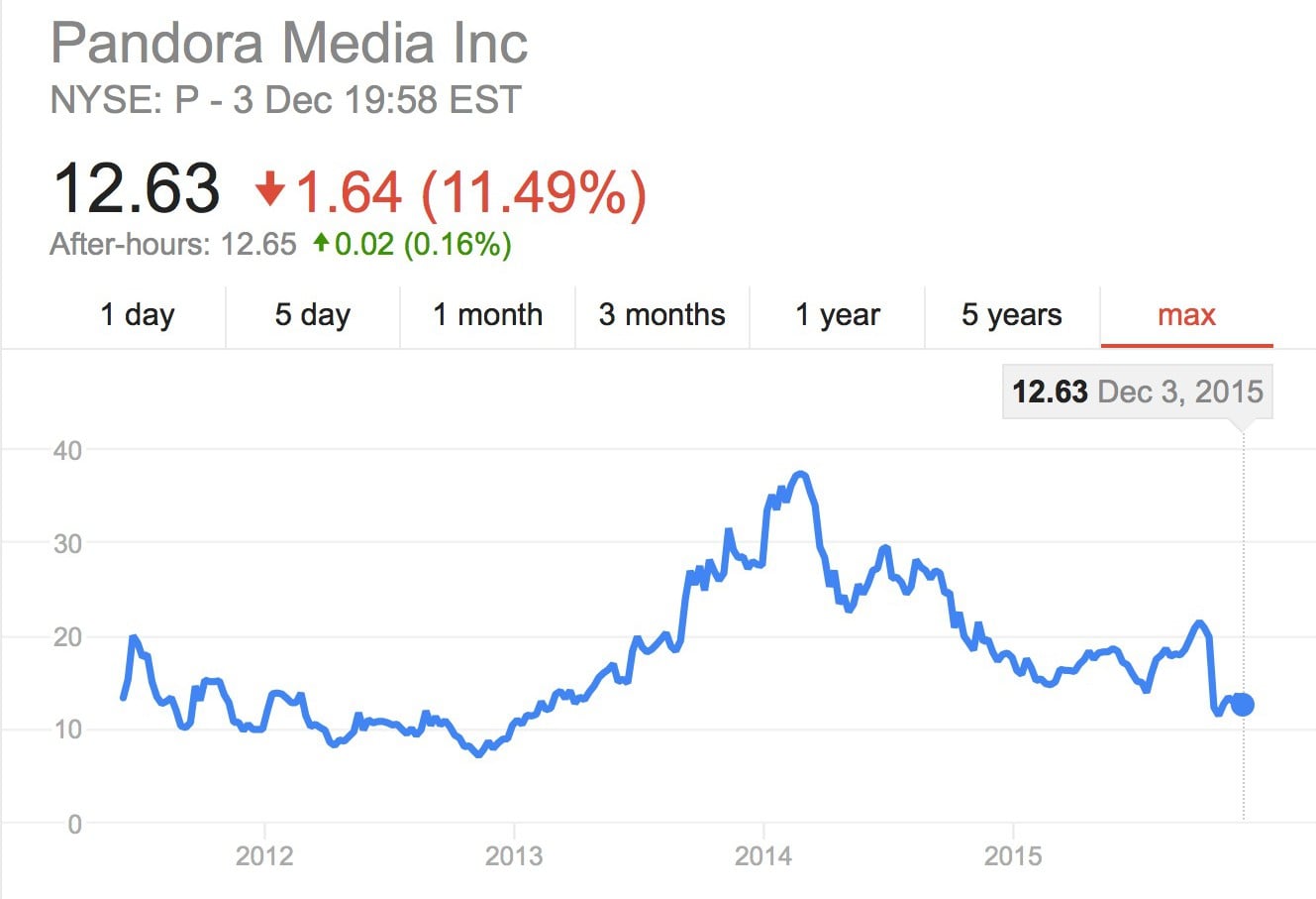 At close of play last night (December 3), Pandora’s stock price had sunk to $12.63.