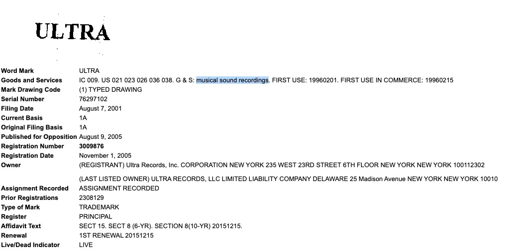 Two trademarks were specifically referenced by Sony Music/Ultra Records in its lawsuit against Moxey/Ultra Publishing. Both are registered with the US Patent and Trademark Office (USPTO), and show Ultra Records’ ownership of the ‘Ultra’ brand name in terms of ‘pre-recorded audio music compact discs’ plus (see below) ‘musical sound recordings’.
