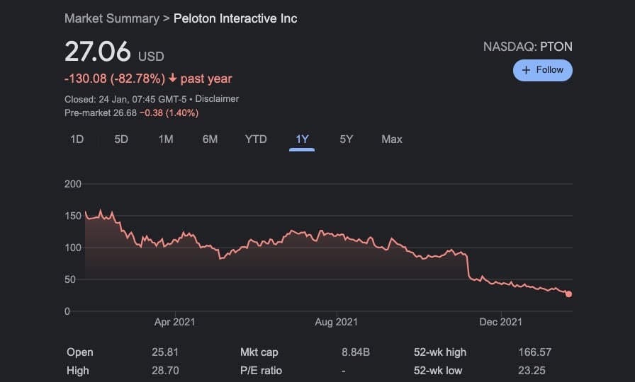 That market cap figure had fallen by nearly $40 billion on the $47.01 billion valuation Peloton closed with a year before, in January 2021 – when the firm had been riding a wave of pandemic lockdown popularity.