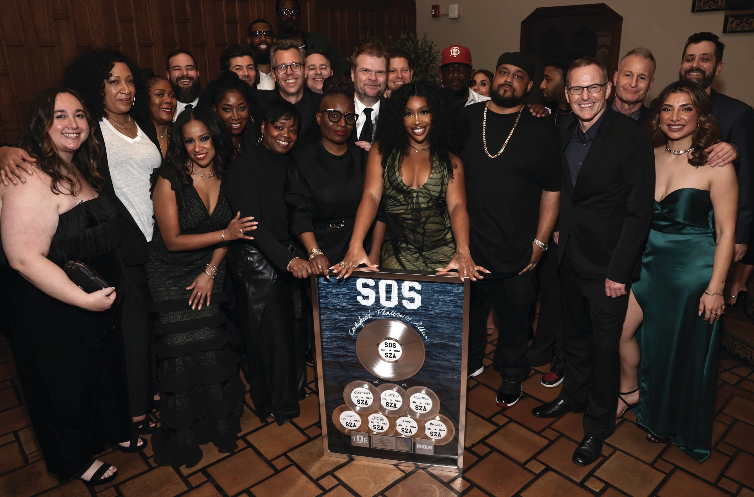 SZA pictured with Edge and RCA execs, plus the Top Dawg Entertainment team and Sony Music Group boss Rob Stringer