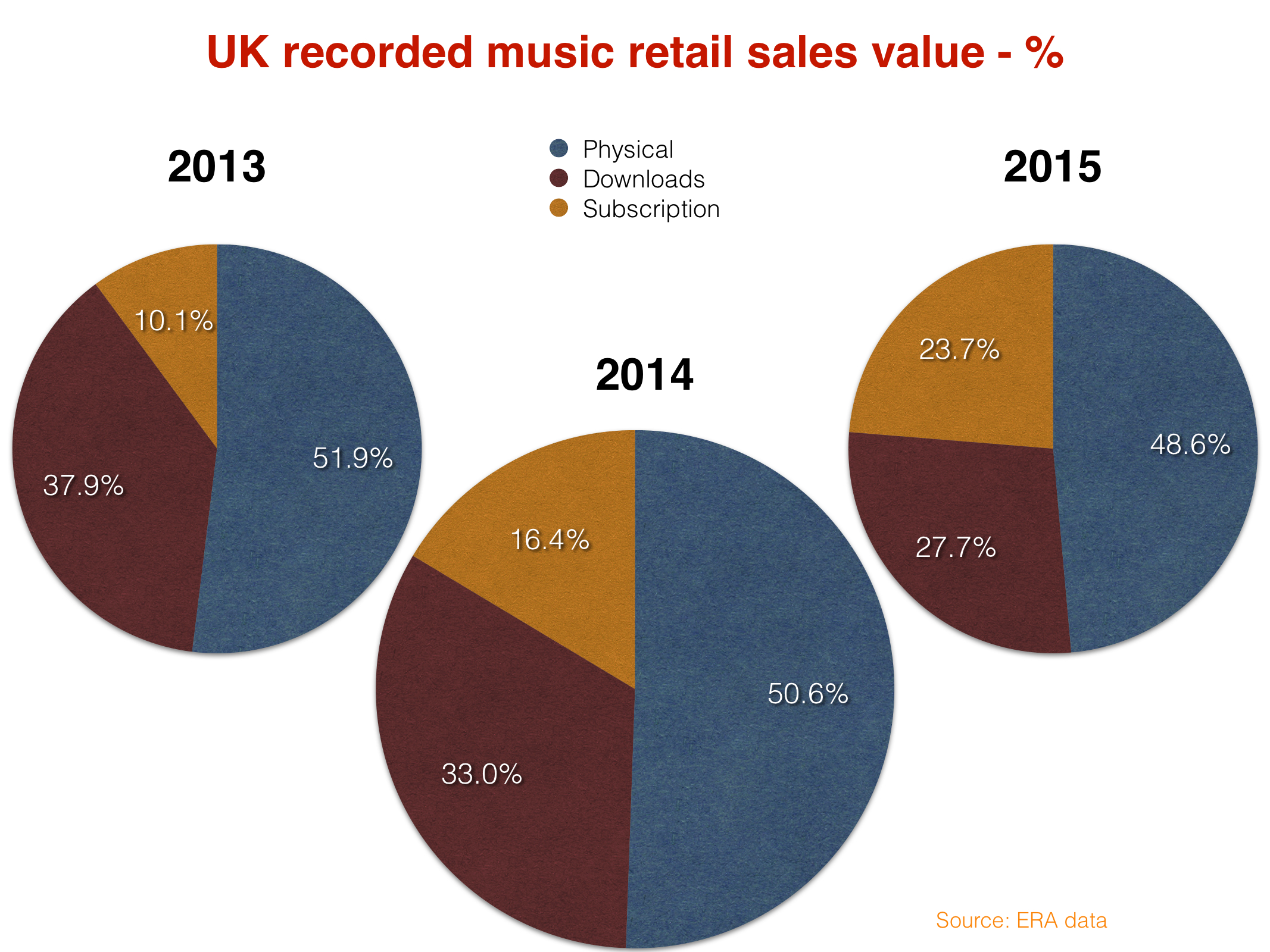 Subscription streaming’s revenue now looks on course to overtake digital download – across both digital albums and singles – in 2016. (The above stats don’t include ad-funded streaming income, or revenue from online video services.)