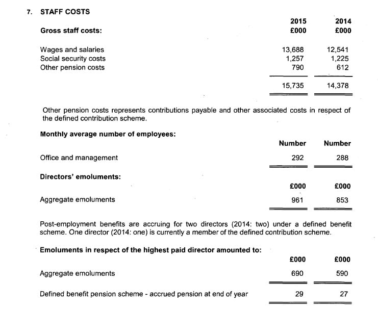 The company’s headcount grew from 288 to 292 people in 2015, with a total staff cost – including pension and social security expenses – of £15.74m, up 9.4% on £14.38m in 2014.