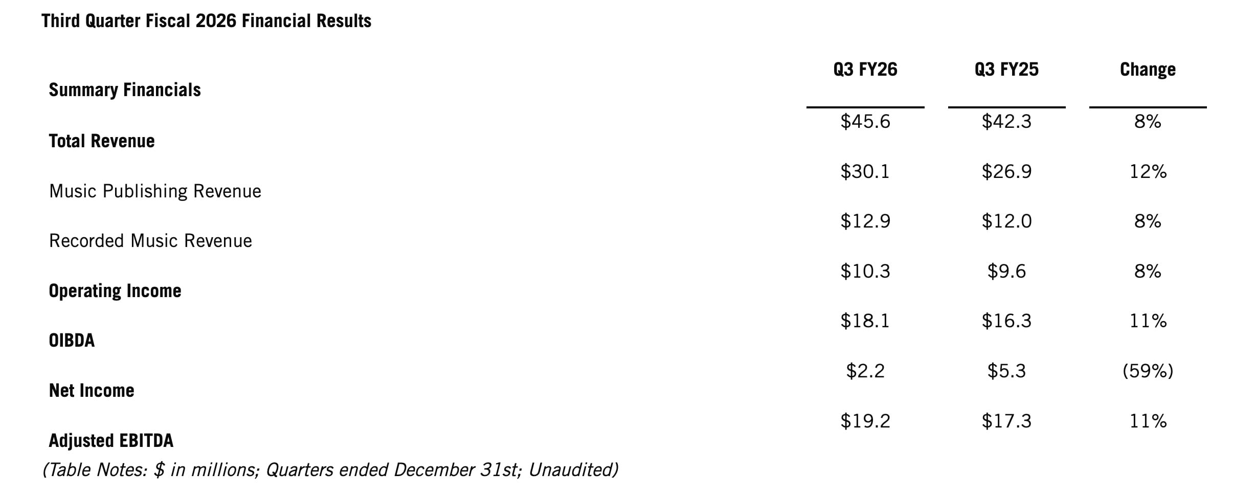 The New York-headquartered music company generated $45.6 million in the quarter, representing8% YoYgrowth, or 5%organically excluding acquisitions.