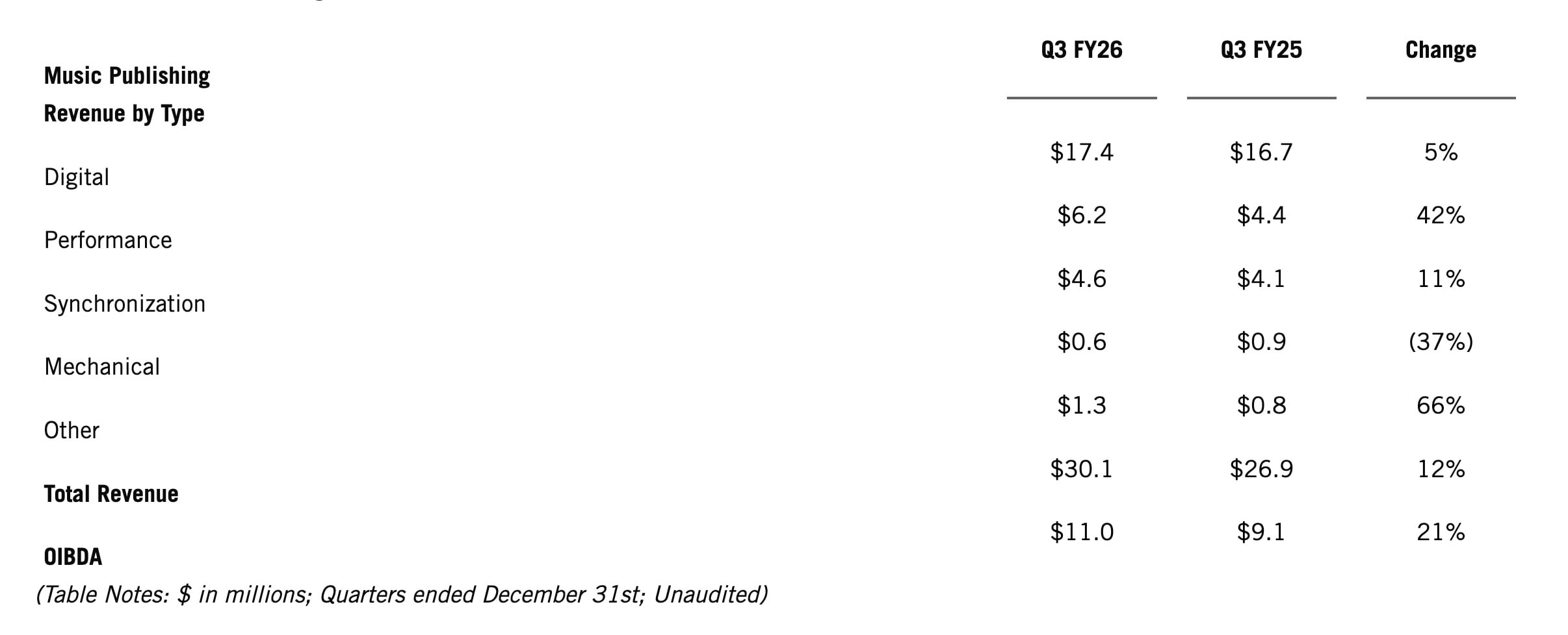 Reservoir’s music publishing segment generated $30.1 million in Calendar Q4, up12% YoY, with OIBDA increasing21% YoYto $11 million.