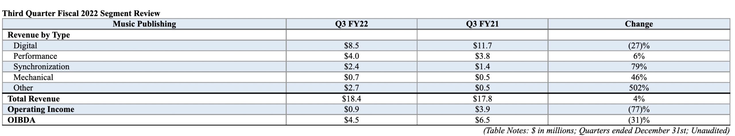 Reservoir’s Music Publishing revenue in calendar Q4 was $18.4 million, an increase of 4% year-over-year.