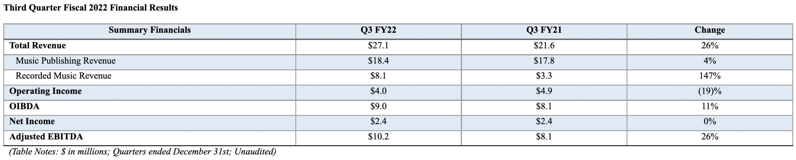 Reservoir’s Recorded Music revenue in its fiscal Q3 2022 grew 147% to $8.1 million, compared to $3.3 million in the prior year quarter (see below).