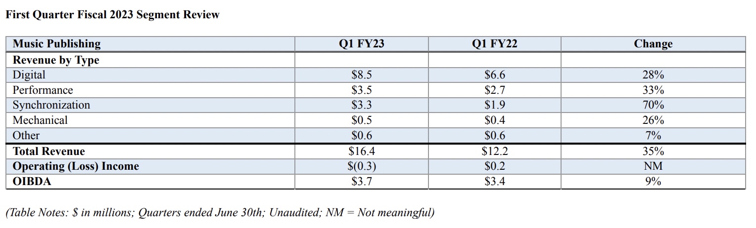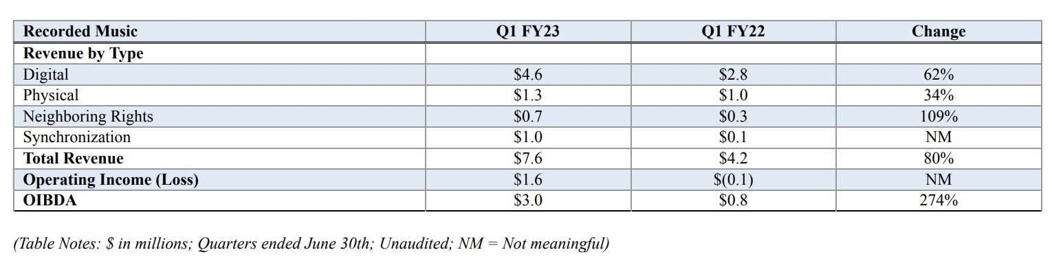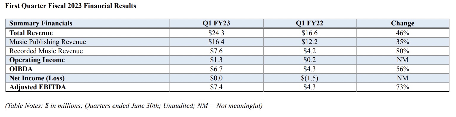 Recorded Music revenues in Reservoir’s fiscal Q1 2023 (calendar Q2) reached $7.6 million, an increase of 80% compared to $4.2 million in the prior year quarter.