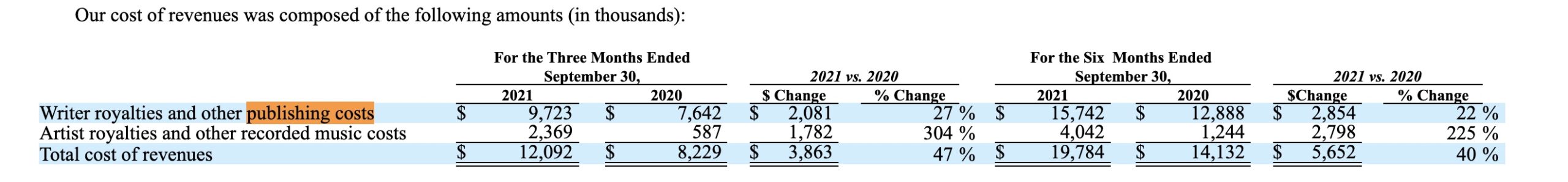 Elsewhere in Reservoir’s filing, the firm reveals that it paid out $9.7 million in songwriter royalties and other publishing costs for the three months ended September 30, 2021, an increase of $2 million, or 27%, from the $7.6 million paid out in the three months ended September 30, 2020 (see below).
