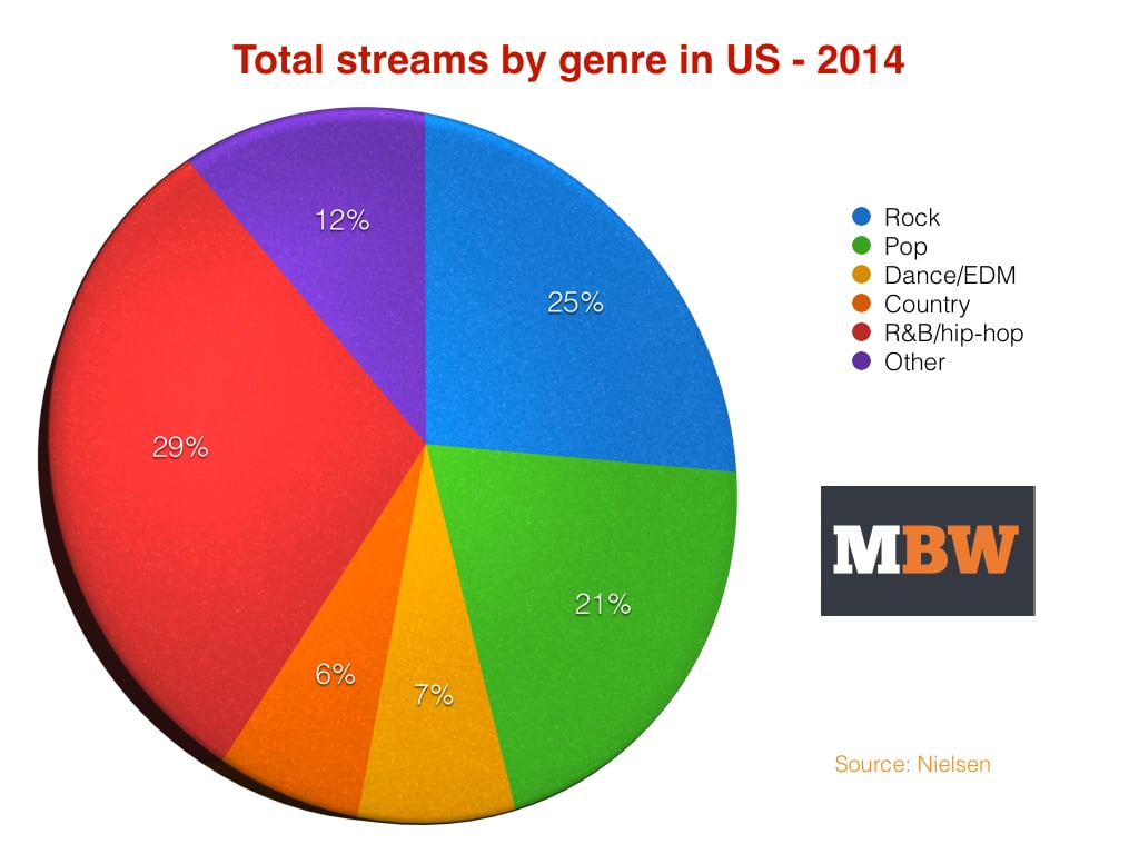 Dividing US 2014 music consumption by genre in terms of streaming makes for some very interesting results: R&B/hip-hop music was the leading genre with 28.5% of all streaming consumption in the year.