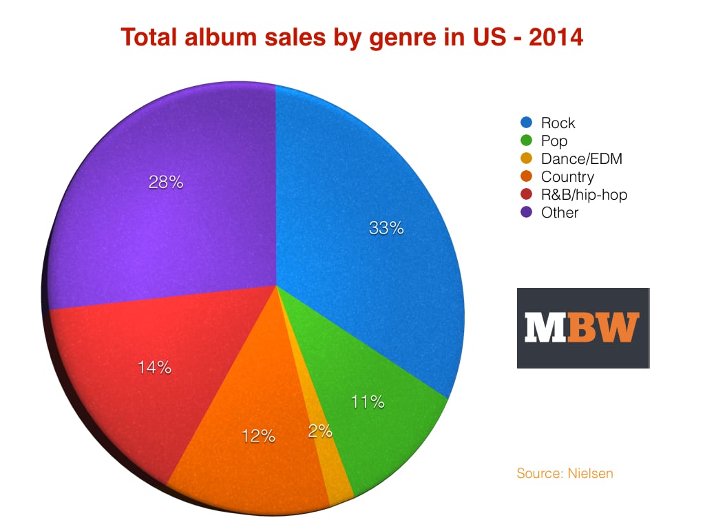 In pure album sales terms, Rock music was hugely dominant in 2014, taking 33.2% of the market ahead of R&B/Hip-hop’s 13.9%.