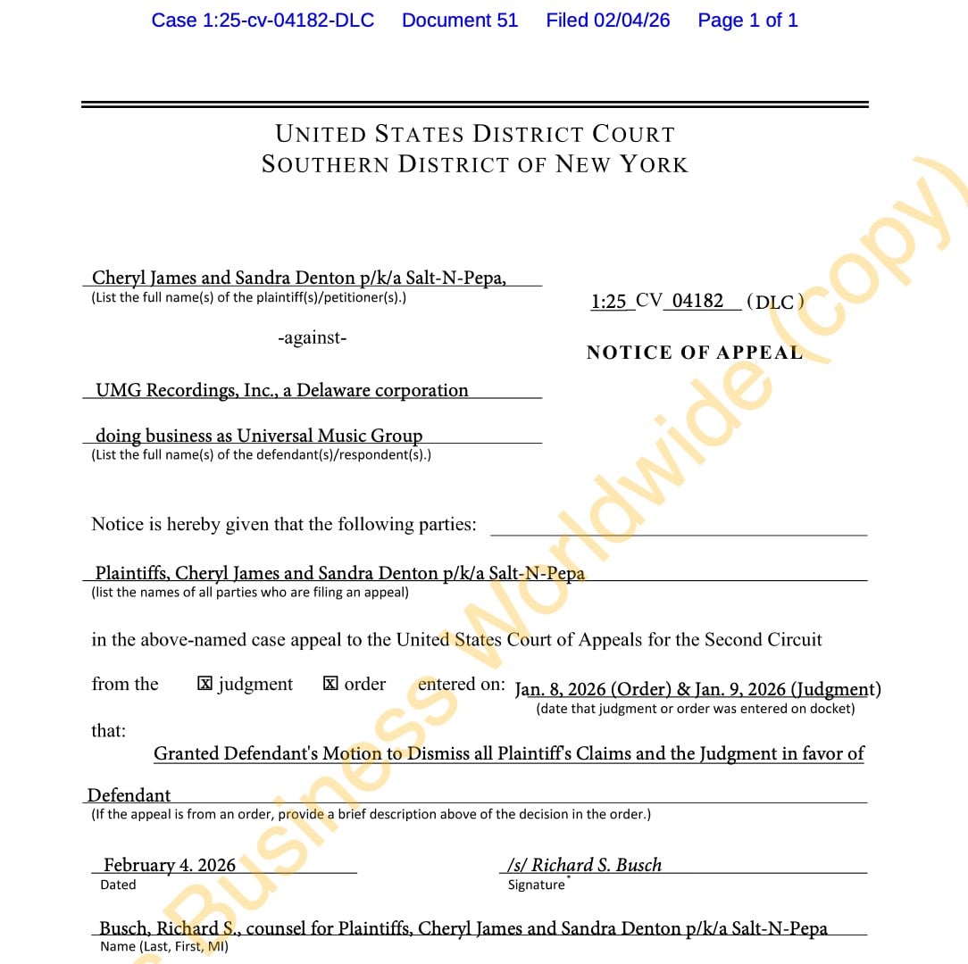 Grammy-winning rap duo Salt-N-Pepa have filed a notice of appeal against the dismissal of their lawsuit against Universal Music Group over the copyrights to their master recordings.